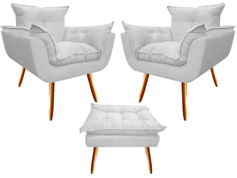 O Kit Com 2 Poltrona Opala + 1 Puff é uma peça essencial para você que gosta de conforto e qualidade, opção excelente para transformar a decoração de seu ambiente. Feita em espuma D-26, madeira refloresta de eucalipto, assento reforçado com percintas elástica e pés palito madeira, é perfeita para preencher seu ambiente. Um excelente móvel para Decorações de Sala de Estar, Dormitórios, Escritórios, Recepções entre outros.